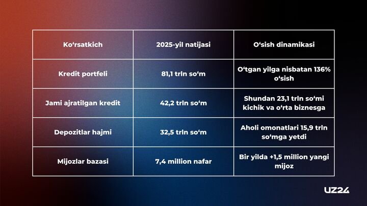Bank xizmat ko‘rsatish falsafasini tubdan o‘zgartirdi. Agar avvallari chakana kredit olish uchun mijozlar o‘rtacha 3 kun kutgan bo‘lsa, 2025-yilda bu jarayon bor-yo‘g‘i 15 daqiqagacha qisqartirildi. Ipoteka kreditlarini rasmiylashtirish esa bir haftadan 1 kunga tushdi.