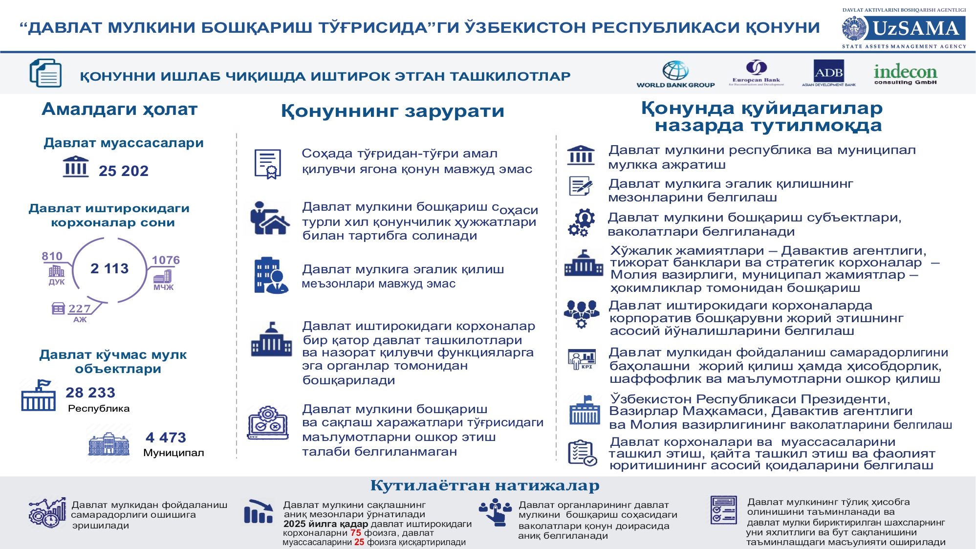 Маълумот учун: "Давлат мулкини бошқариш тўғрисида"ги Ўзбекистон Республикаси Қонуни Олий Мажлиснинг Қонунчилик палатаси томонидан жорий йил 15 мартда қабул қилинган.