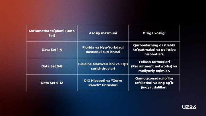 Eʼlon qilingan materiallar 12 ta alohida “Maʼlumotlar toʻplami”ga (Data Sets) boʻlingan boʻlib, ular Epsteyn va uning sherigi Gislaine Maksvellga qarshi Nyu-York va Floridada ochilgan turli jinoiy ishlarni, shuningdek, FQB (FBI) ning koʻp yillik surishtiruvlarini qamrab oladi.