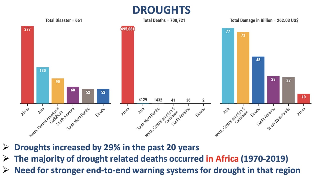 Шарқий Африка давлатлари бу борада энг кўп зарар кўрмоқда. Climate Hazards маркази мутахассиси Крис Функнинг таъкидлашича, ҳудудда 1999 йилдан олдин қурғоқчилик мавсуми фақат ёмғир ёғмайдиган пайтлардагина 5-6 йилда бир марта юз берган бўлса, 2000 йилдан буён март ва май оралиғида ҳар йили қурғоқчилик кузатилмоқда. Ўтган йилнинг июнь ойида Мадагаскар иқлим ўзгаришлари келтириб чиқарган қурғоқчилик сабабли очликка йўлиққан дунёдаги биринчи мамлакат сифатида қайд этилган эди.