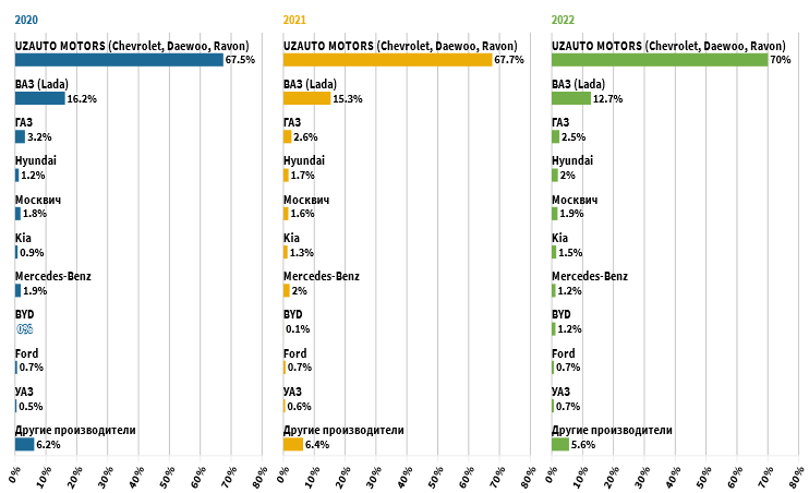 Иккиламчи автомобиль бозорининг 70 фоизи Ўзбекистонда ишлаб чиқарилган автомобиллар ҳиссасига тўғри келади, бозорнинг беш баравар кам улуши ёки умумий бозорнинг қарийб 13 фоизи ВАЗ (Lada) автомобиллари, яна 2,5 фоизи ГАЗ автомобиллари ва 2 фоизи Hyundai автомобиллари ҳиссасига тўғри келади. Таҳлил шуни кўрсатдики, 10 та сотувга қўйилган маҳаллий автомобиль 4-5 та сотувга қўйилган хорижий автомобилга тўғри келади. Йил давомида иккиламчи бозорда электромобилларнинг улуши деярли икки баравар кўпайган.